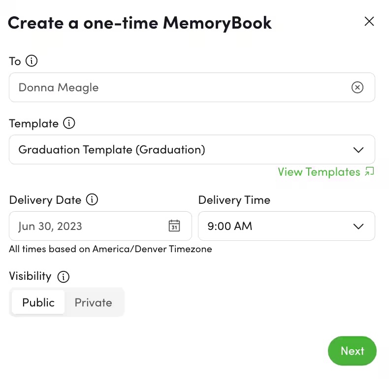 - Select the recipient of the MemoryBook