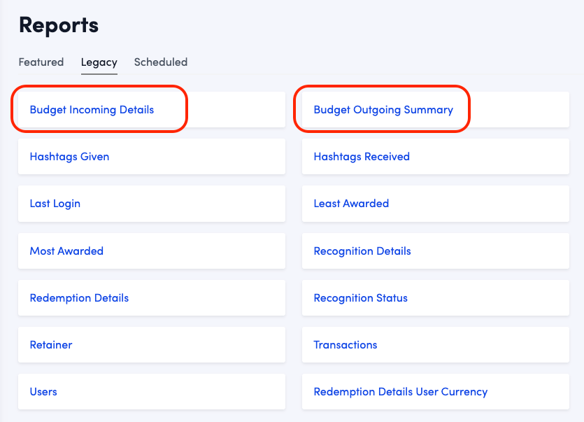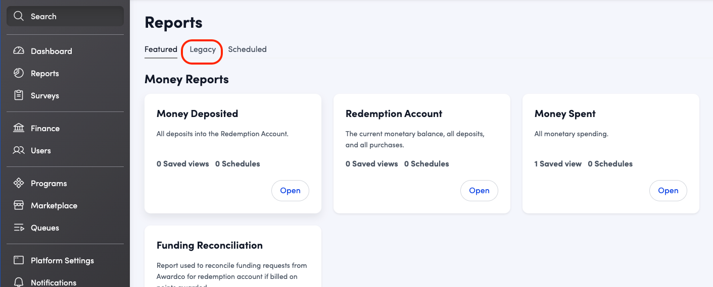 You will be taken to a list of available reports. Click on Legacy at the top of the page.