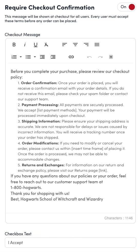 Awardco's new "Require Checkout Confirmation" feature allows Awardco admins to display custom messages to users before they finalize their orders. This ensures users are fully informed about potential implications, such as tax obligations, before completing their redemption.
