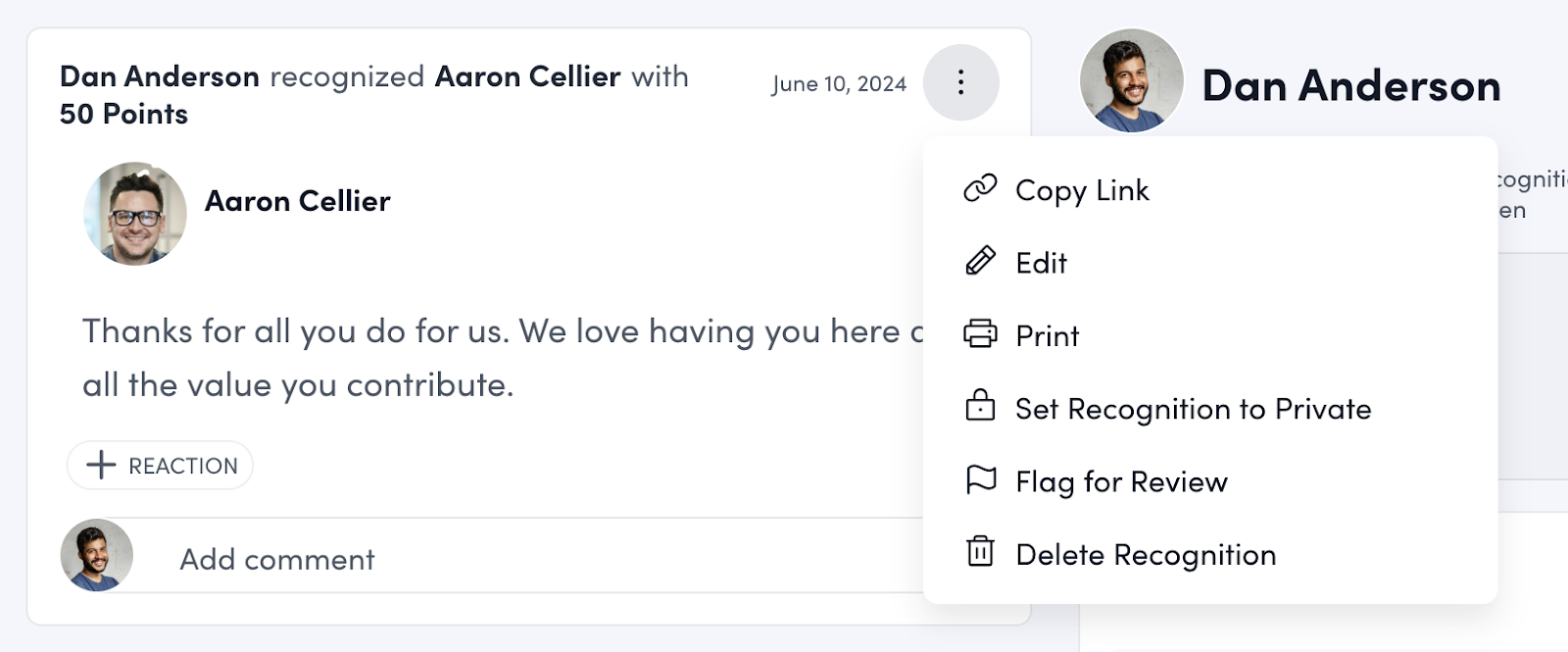 Deleting a recognition removes it from the main feed and the recipient's "My Recognitions" tab.