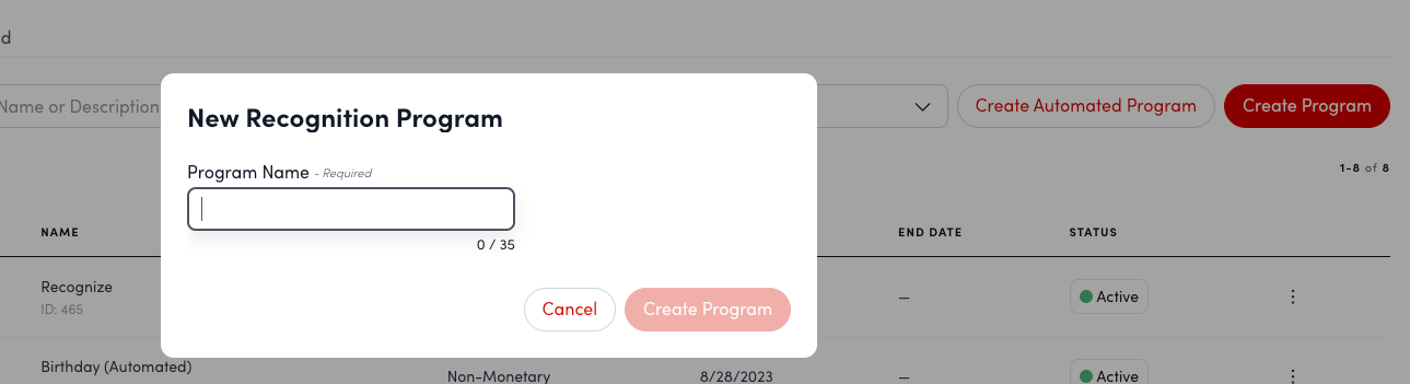 - Selecting “Add Automated Program” button begins the process of creating a recognition program that will allow you to link recognitions from service awards, birthdays, and onboarding programs to recognition programs for reporting and award network associations.