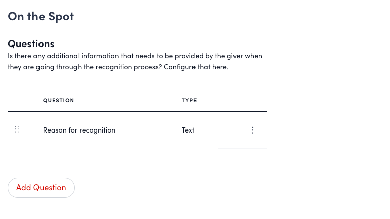 Customize the questions asked during recognition submissions. The default question is “Reason for recognition.”, but you can modify this open ended question with text specific to your program. To edit or add questions:
