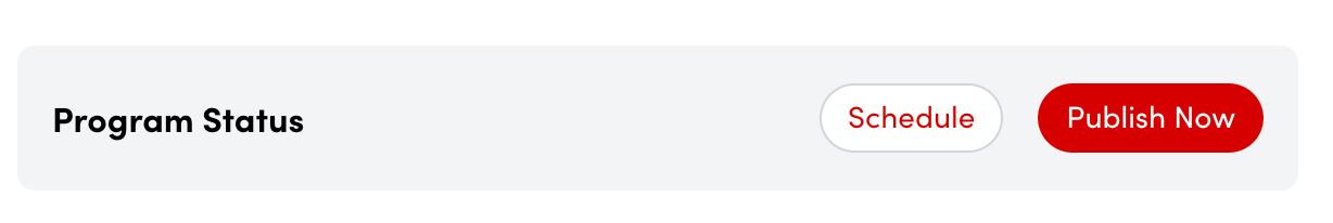 To make a program "active" or "live," select "Publish Now" or "Schedule," located at the top of any program settings page. "Publish Now" will activate the program immediately upon selection. "Schedule" allows you to activate the program at a specified date and time in the future.