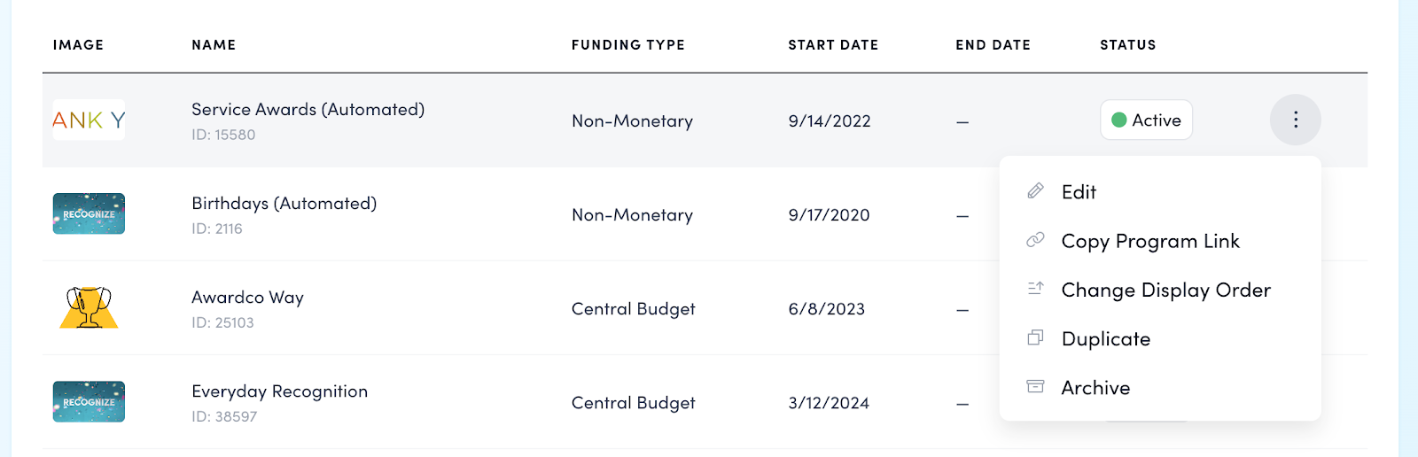 On the main Recognition Programs page, all active recognition programs are listed with their details, including images, names, program ID, funding methods, start dates, end dates (if applicable), and status. To edit, reorder, or duplicate any program, click the three-dot icon to the right of the program's name.