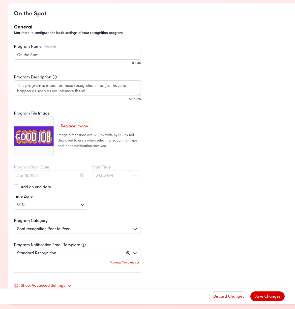 - Program Notification Email Template: Choose the email template recipients will receive upon recognition. Click the ‘Manage Templates’ link to see all the email templates in your platform.