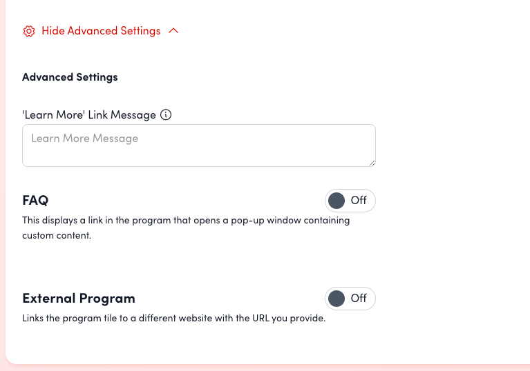 - ‘Learn More’ Link Message: Text shown when users select "learn more" for program information (2,000-character limit).