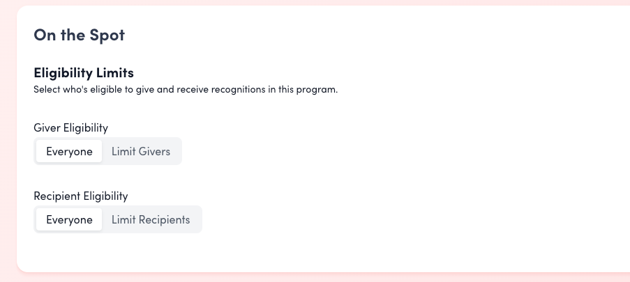 Select who's eligible to give and receive recognitions in this program. If this program is available to all employees imported into your recognition platform, make sure both Giver and Recipient Eligibility toggles have “Everyone” selected. To begin: