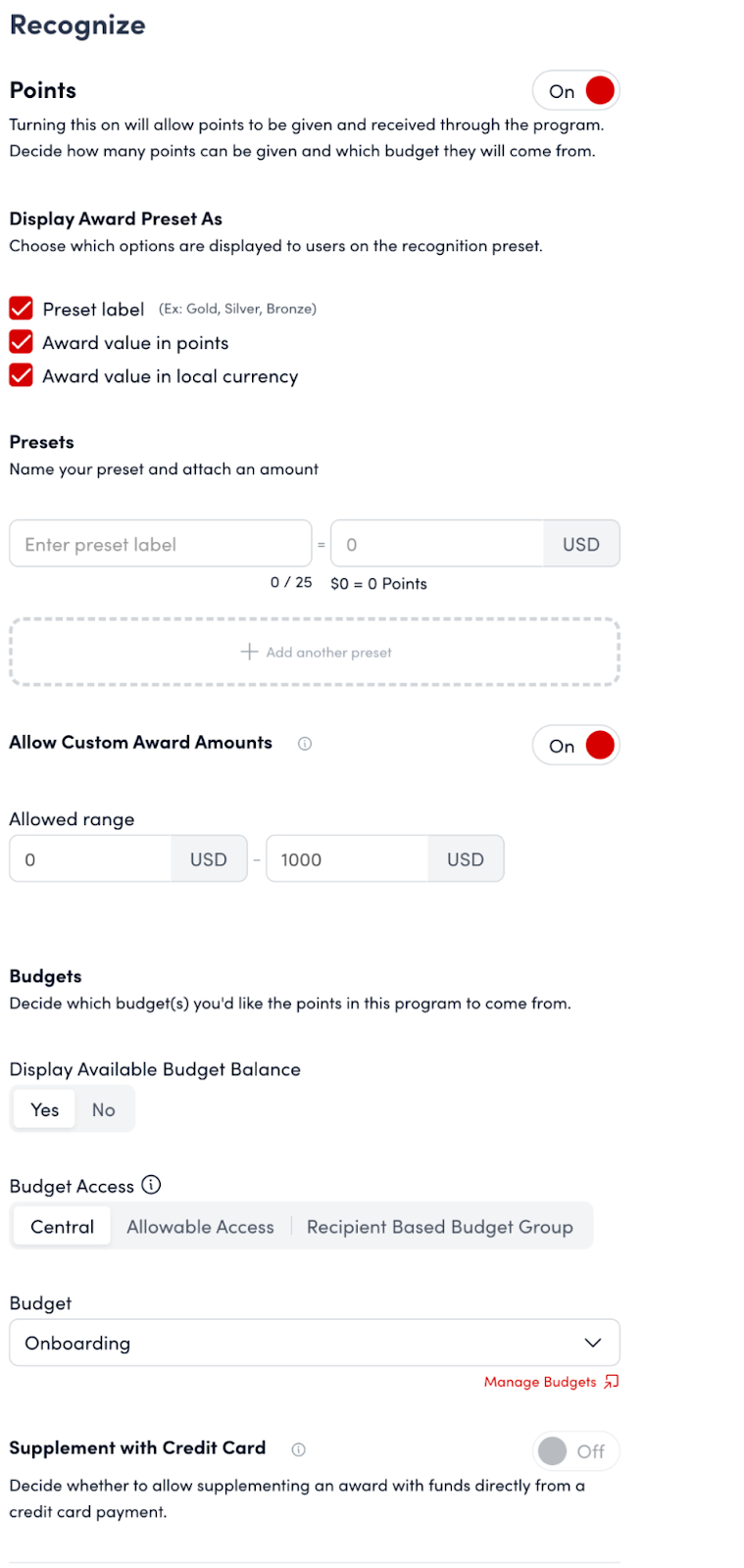 - Central Budget- Choose a single budget from which all points awarded through this program will be sourced.