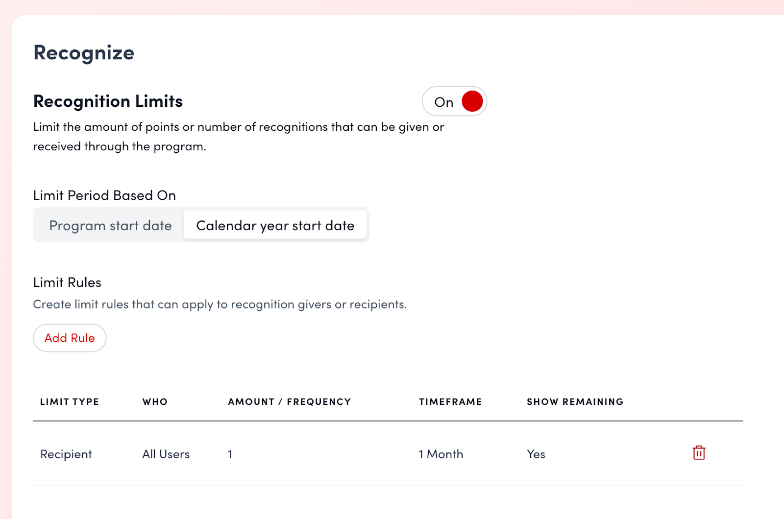 Control the maximum number of points or recognitions that can be given or received through this program.