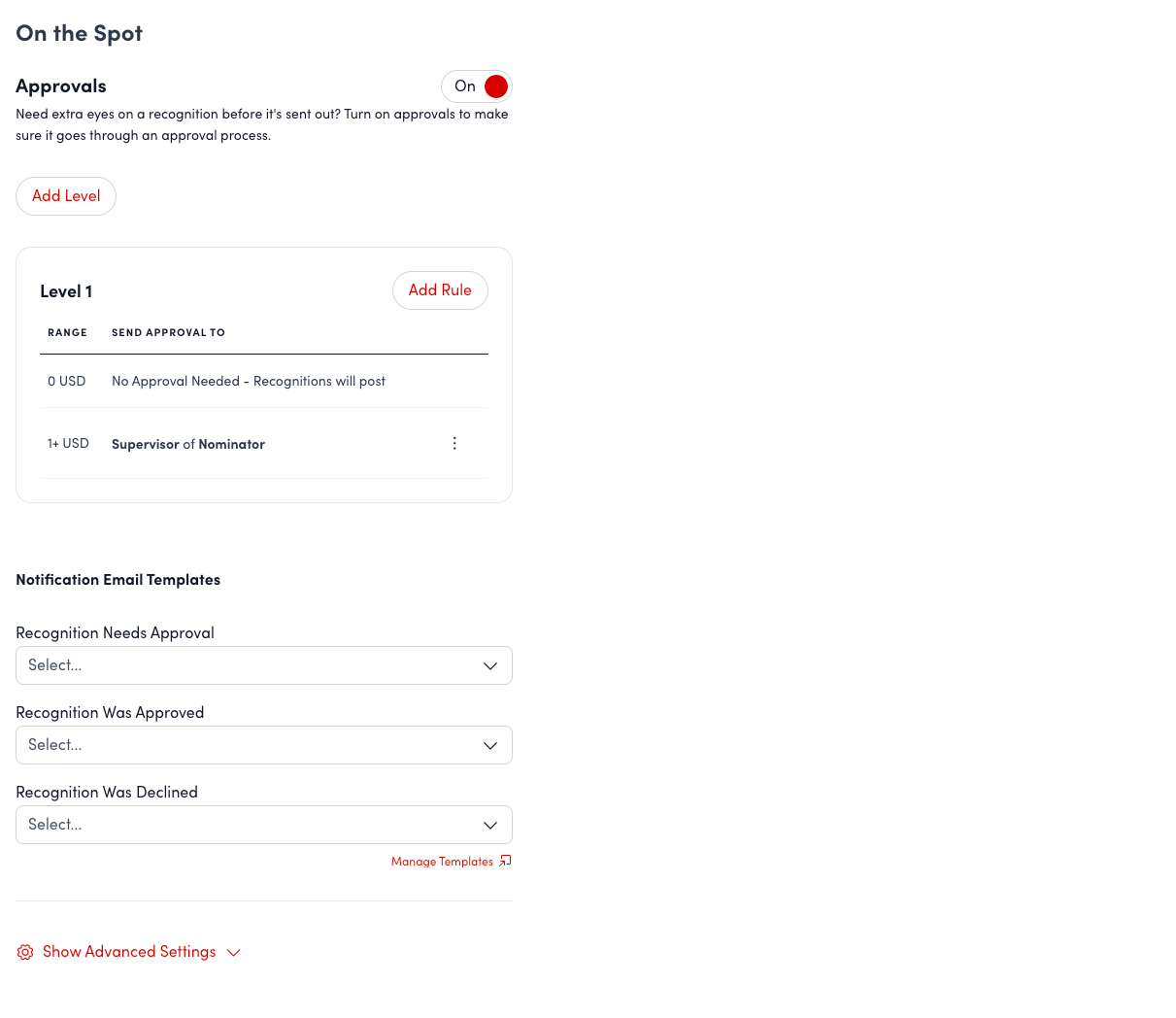 Enable approvals to require recognition approvals within this program. If recognitions do not require approvals, leave this setting disabled. Upon enabling, a Level 1 approval will automatically appear. To configure this approval: