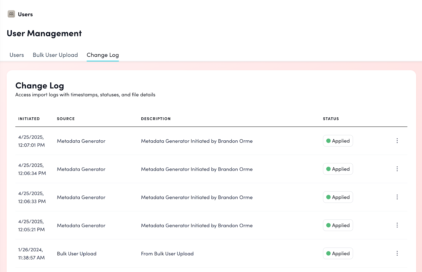 This page displays a complete history of all user file imports, including the date of initiation, the import source, a description (containing the file name, size, and the name of the user who initiated the import), and the import status. Click the three dots to the right of any import to access options for viewing the import summary, downloading the specific user file upload, or deleting the user file.