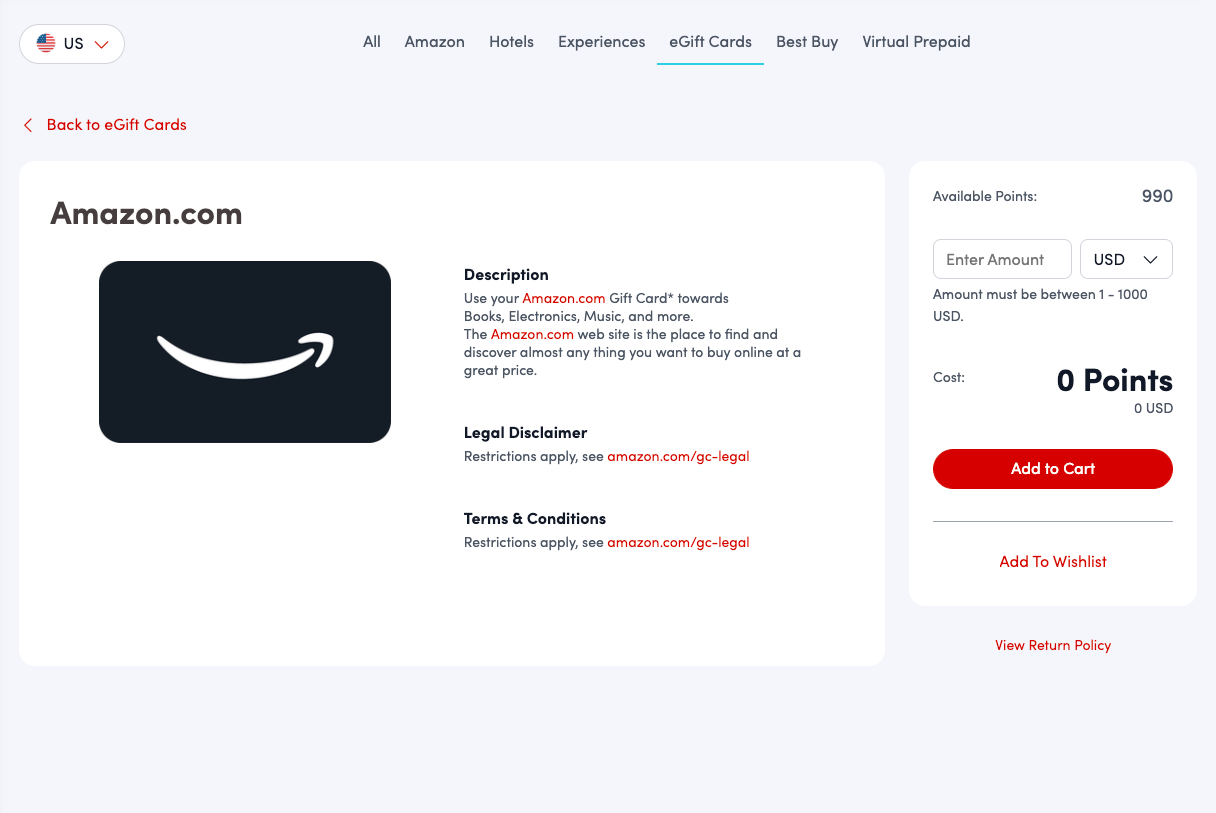 Selecting the desired eGift Card will bring you into the card redemption screen. Here, you will input your desired eGift Card value. Some eGift Cards have preset limits, others have custom quantity fields. Once you have chosen a preset amount or entered the desired card value, the blue points indicator (shown just above the card value) will display the point amount required to redeem the eGift Card. Press “Add to Cart" once you are ready to continue.