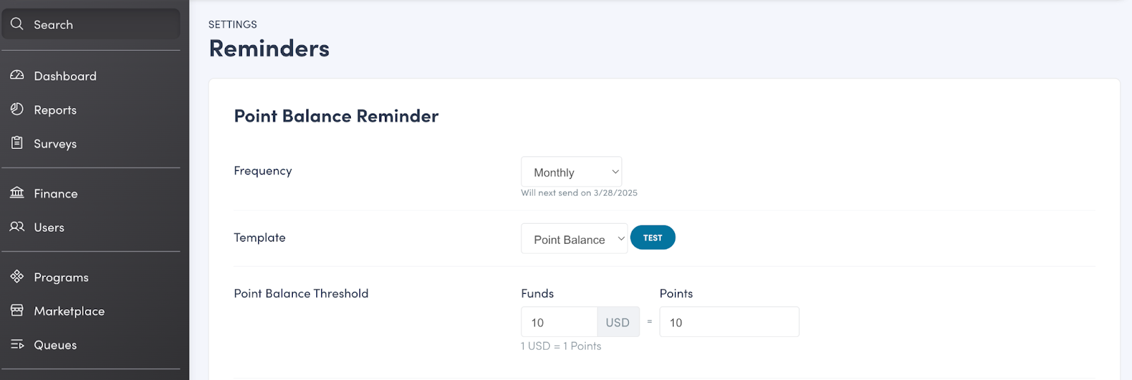 - Select "Test" to receive a sample email of the chosen point balance reminder template. The test email will be sent to the currently logged-in user, displaying their point balance.