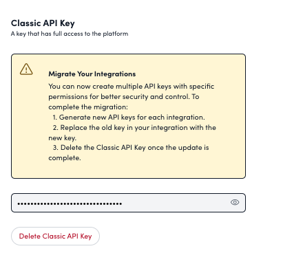 - Delete Your Classic API Key: Once all integrations are updated, click the "Delete Classic API Key" button at the bottom of the API Settings page.
