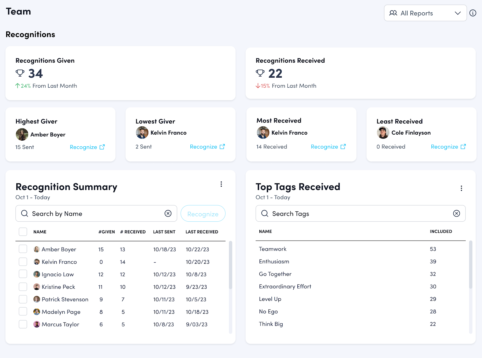 Ultimately, this section aims to help you dive into detailed data illuminating how users are recognizing their peers and understand the dynamics of positive interactions within your team. Easily recognize any user presented in this section with the blue Recognize links.
