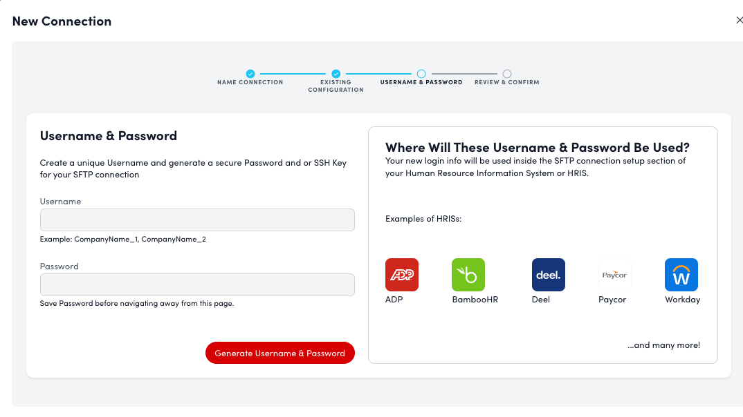 If creating a new connection, click "Generate Username & Password" and securely store this information.