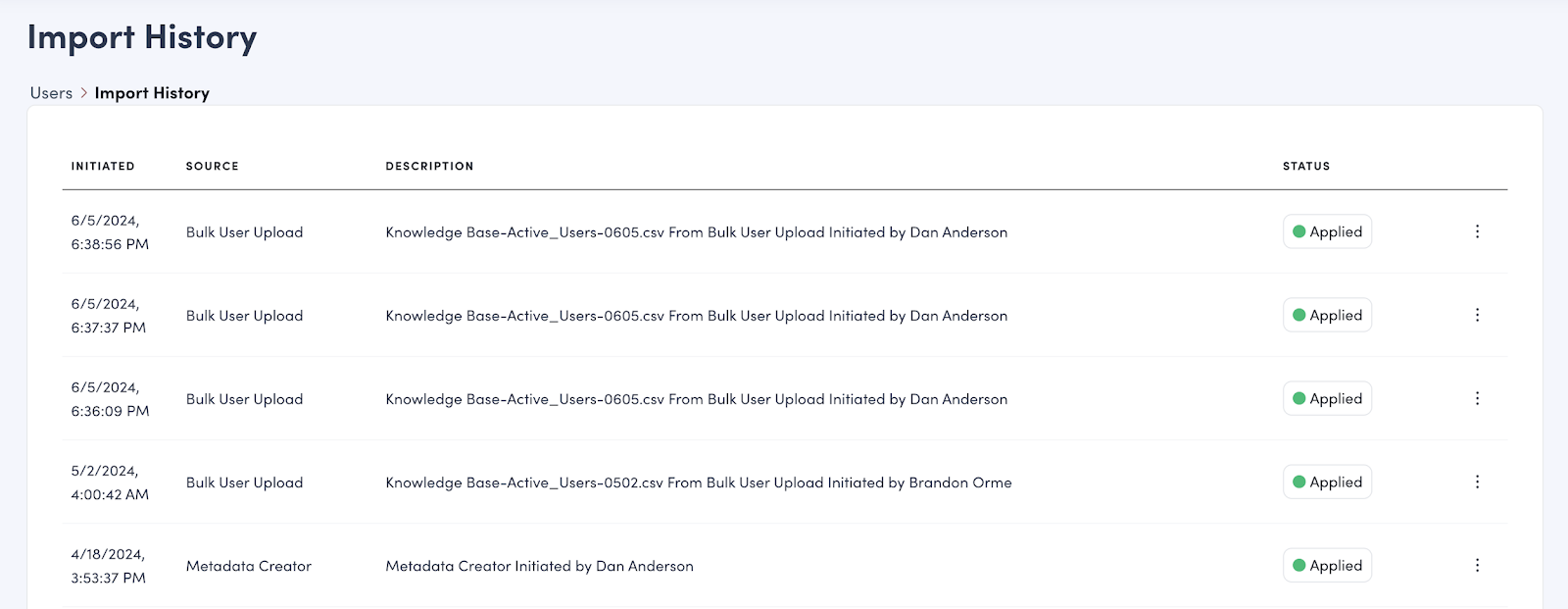 - This view on the ‘Users’ tab in Admin settings shows all past file uploads.