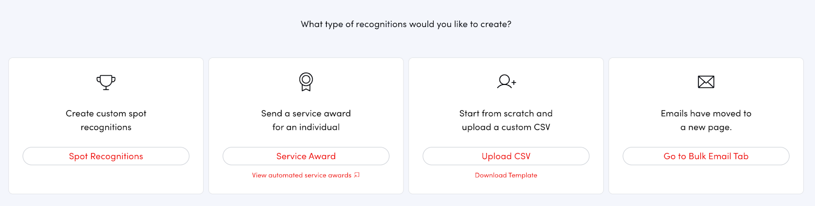Creating and sending one-off recognitions is now easier than ever. Use our improved Bulk Recognition interface to send recognitions outside of a recognition program for purposes like one-off company events, missed service awards, or company announcements. Refer to the article below to get started.