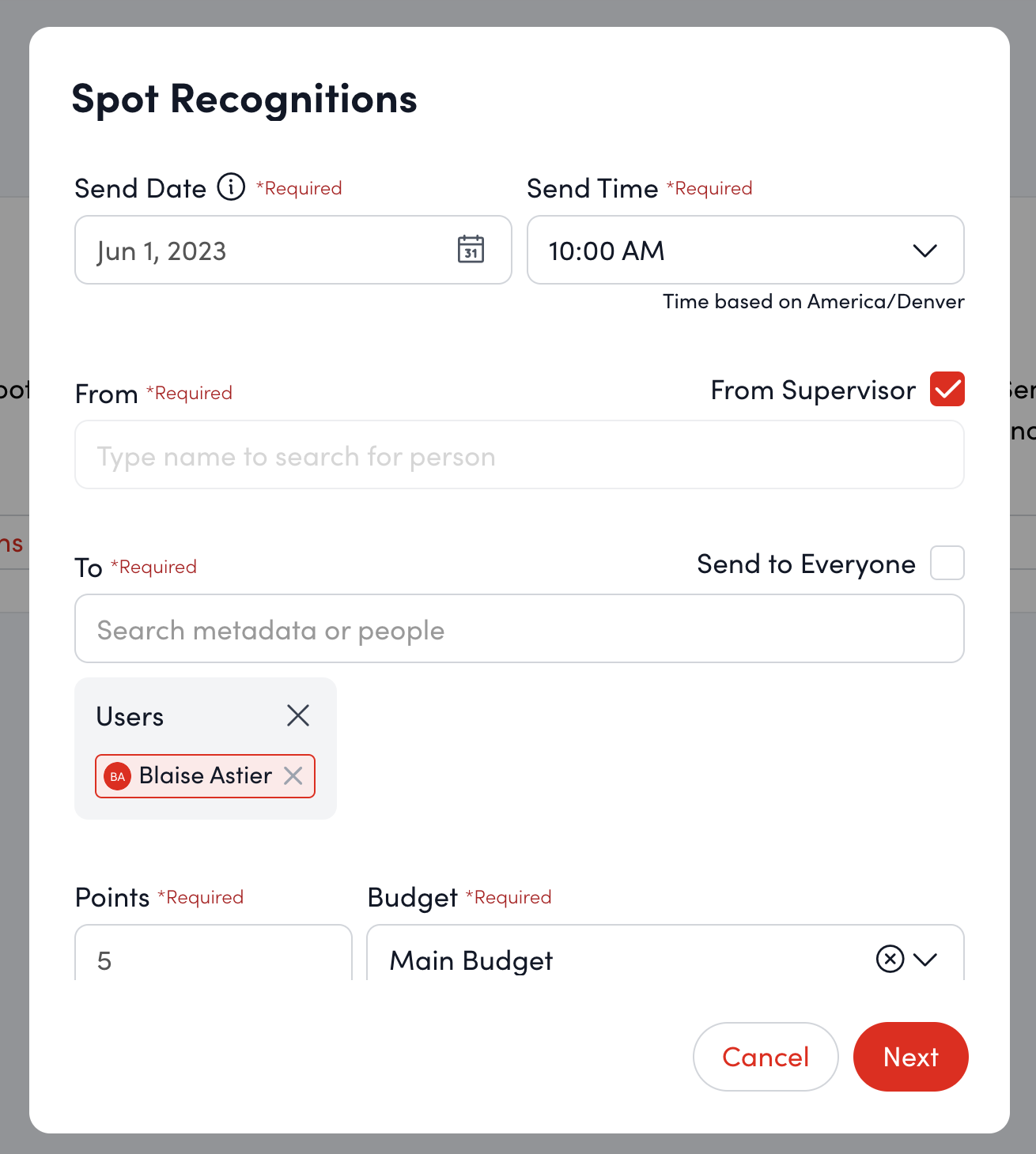 - Send Time* - Select a time you’d like to send the recognition. The time zone will register based on the location reported by your internet browser.