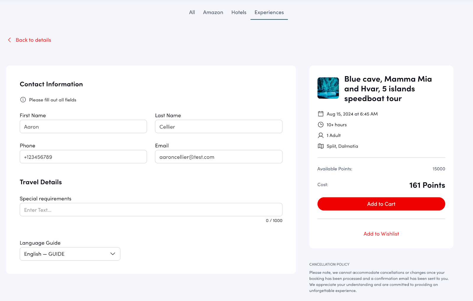 - Review and Add to Cart: Review the experience details and the total cost, then click Add to Cart.