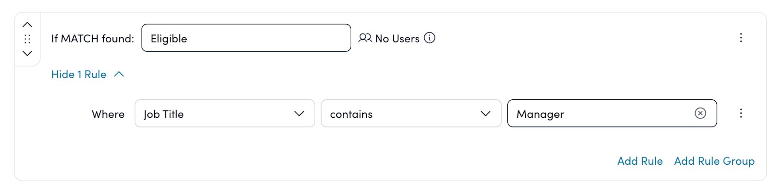 Creating a Manager to Peer recognition program is a great application of Awardco. Determining eligibility can be simplified by creating metadata based on an existing #Title metadata column. For example, you could create a new value called “Eligible” with a rule condition stating “Where Title contains Manager.” This would identify any title including the word “Manager” and apply the “Eligible” value to that employee's data.