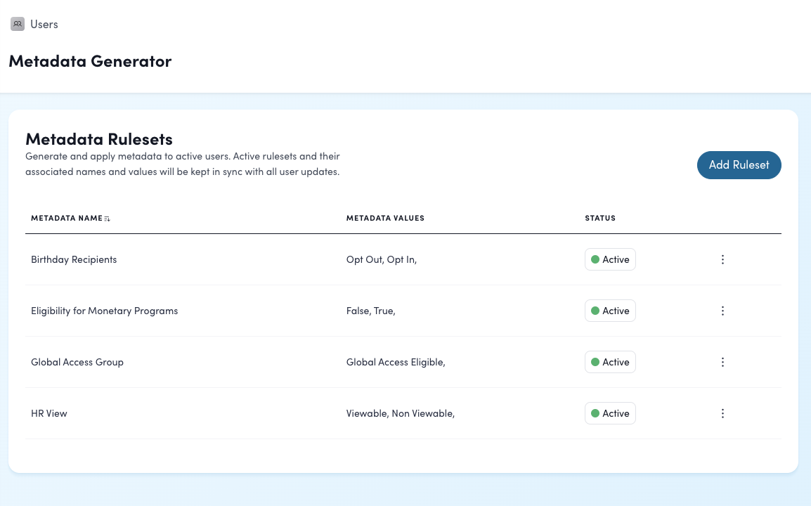 The initial view of the Metadata Generator tool displays a list of all previously created metadata rulesets, the corresponding values generated in the metadata column, and the status of each ruleset. An active status indicates that the metadata is available for use within the platform for features like budgets and program eligibility. Once a metadata ruleset is generated, you can access and modify it at any time by clicking the “...” icon to the right of the metadata status and selecting “Edit” from the dropdown menu. The dropdown also provides options to “Duplicate” or “Delete” the ruleset. Deleting a ruleset permanently removes it and all associated metadata values. Duplicating a ruleset can be advantageous when creating multiple rulesets with similar configurations.