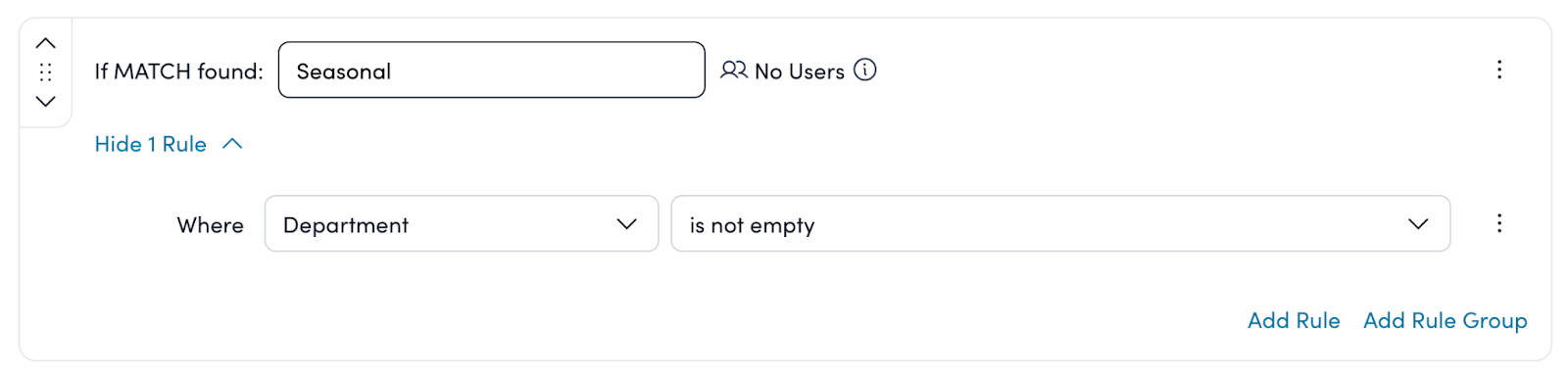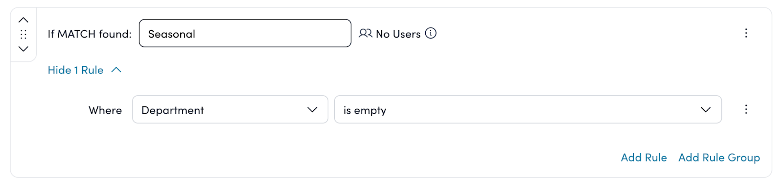 Companies with large workforces or seasonal employees often have incomplete metadata for all users. To tag seasonal workers, you can create a new Value Name like “Seasonal” and set the condition to “Where Department is empty.” This condition doesn't require specifying any existing data.