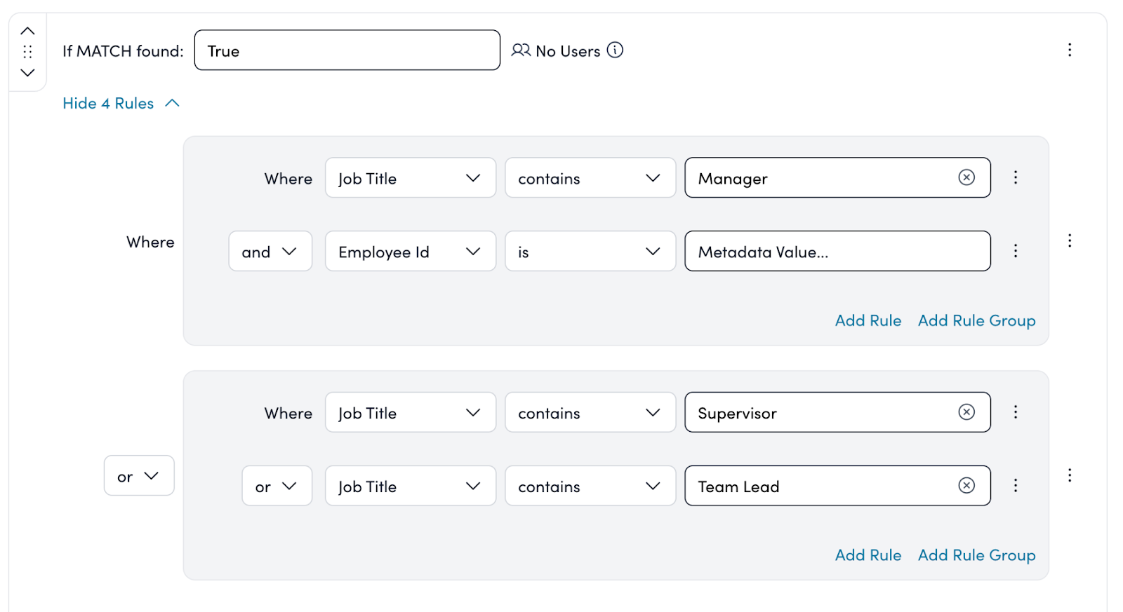 Creating a rule group allows you to combine multiple conditions within a single rule. This is beneficial when a metadata value needs to meet several criteria that involve different combinations of “and”/“or” logic. To illustrate rule grouping, consider an example of generating metadata for employees who have direct reports.
