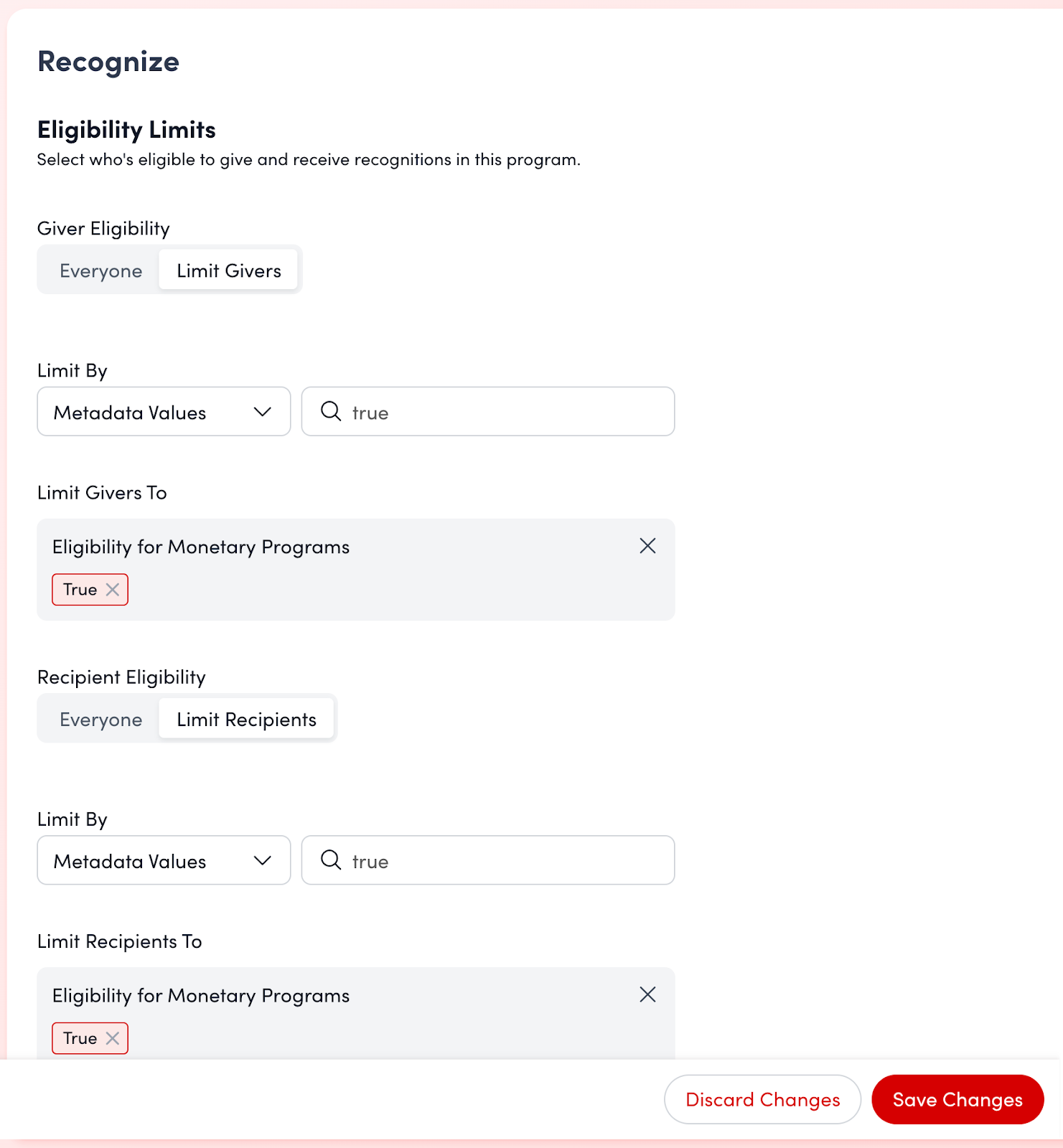 Finally, they click “Save Changes” and then “Save & Apply Changes.” Now, when configuring the Nominator and Recipient eligibility for the monetary program, the newly created “Eligibility for Monetary Programs” metadata is available, allowing them to restrict program access to full-time employees in the US.