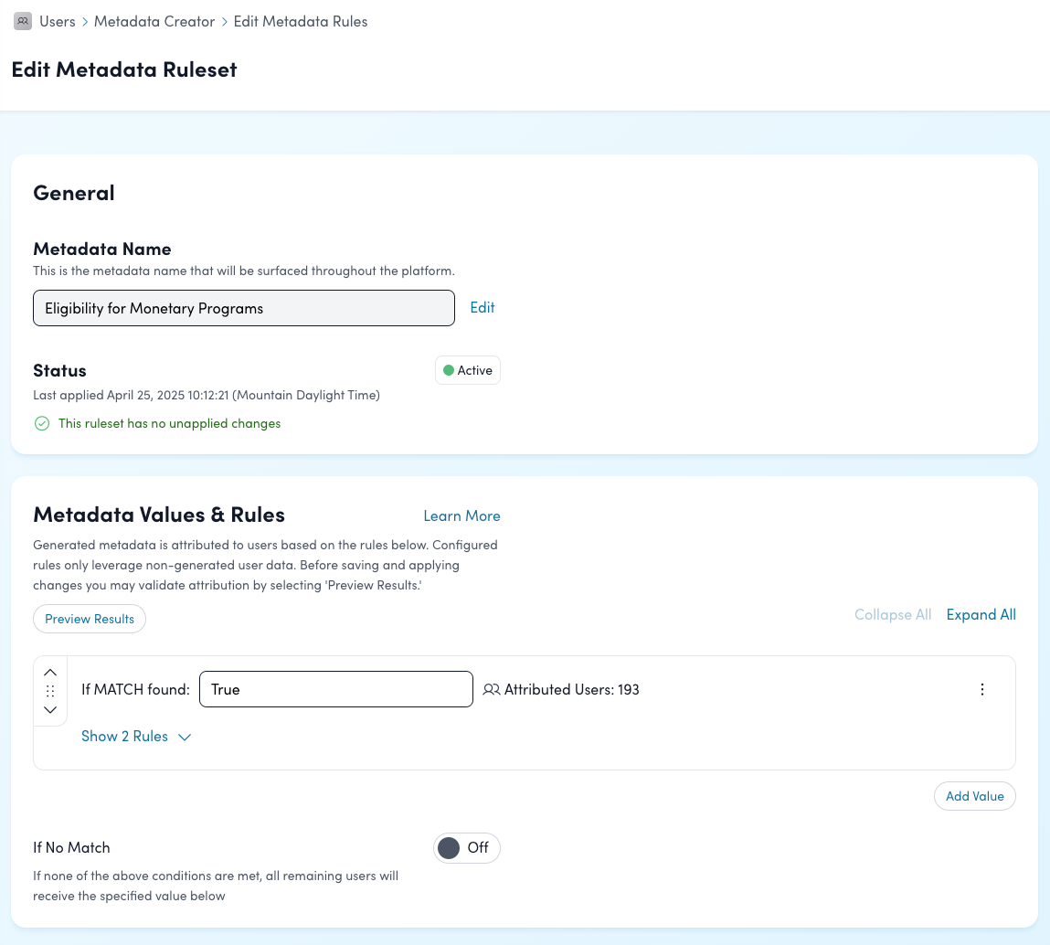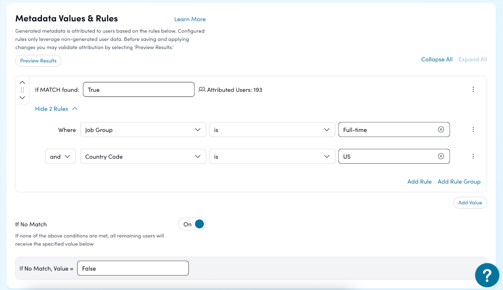 - Preview Results: Before saving and applying changes to your ruleset, you can verify that values are correctly assigned to users by selecting 'Preview Results.' Clicking “Preview Results” will download a .csv file named after the Metadata Name. This file will include a sample of your users alongside the metadata ruleset you are previewing. The metadata ruleset column header will be enclosed in double asterisks (e.g., Eligible). This feature allows for unlimited testing to ensure accurate attribution before saving.