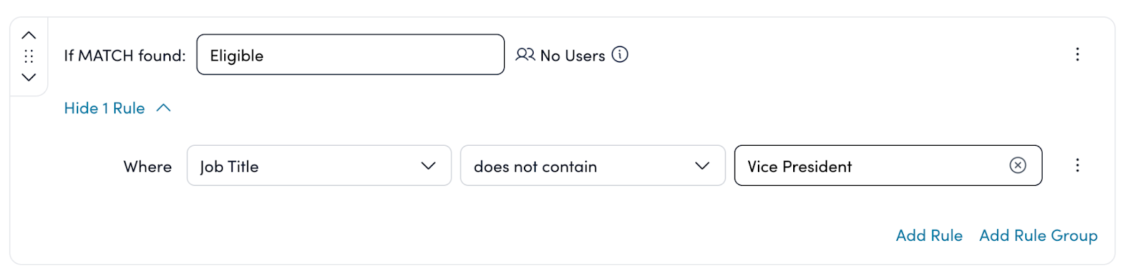 The “Does not contain” logic is also valuable for specifying program eligibility. For instance, to restrict a program to employees who are not in upper-level management, you could use the condition “Where Job title does not contain Vice President.”