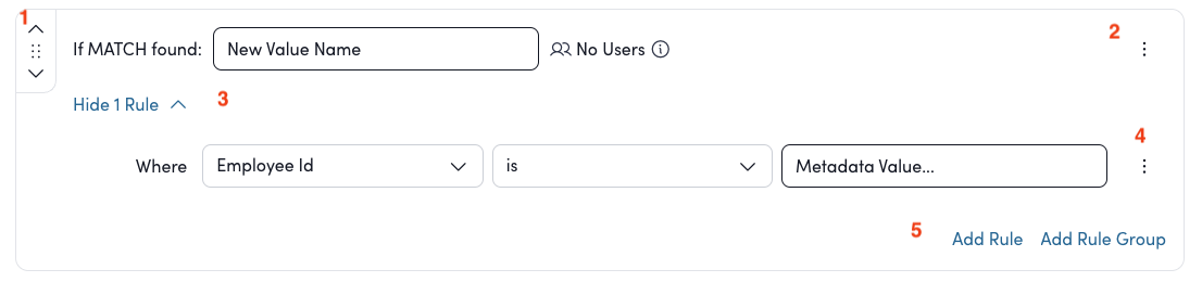 The field to the right of these dropdown menus is where you enter your existing data (Employee ID, Country Code, or metadata value). Understanding the meaning of these rule components enables you to construct effective rule conditions. Let's explore an example of each conditional option to illustrate practical use cases.