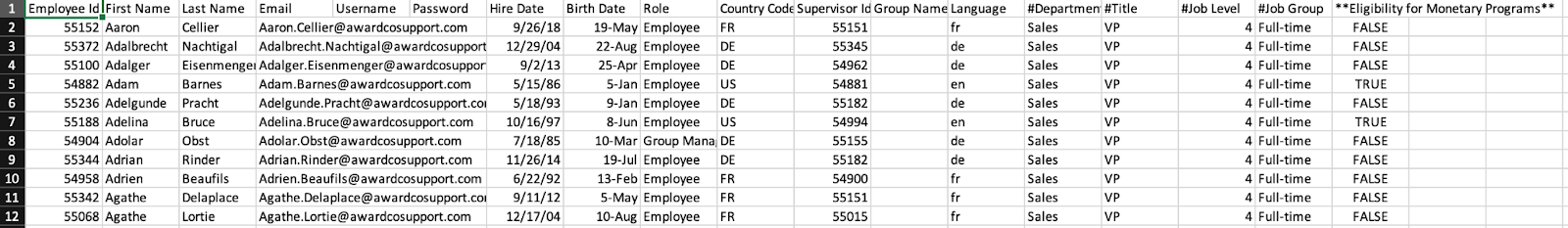 Uploading comprehensive employee data is crucial for the smooth operation of your Awardco platform. The data in your user file empowers employees and enables accurate configuration and analysis across both Recognition and Engage products. While we specify required and recommended fields for your user file, metadata, or additional information, can be incorporated to refine program eligibility, budget allocation, and survey participant lists.