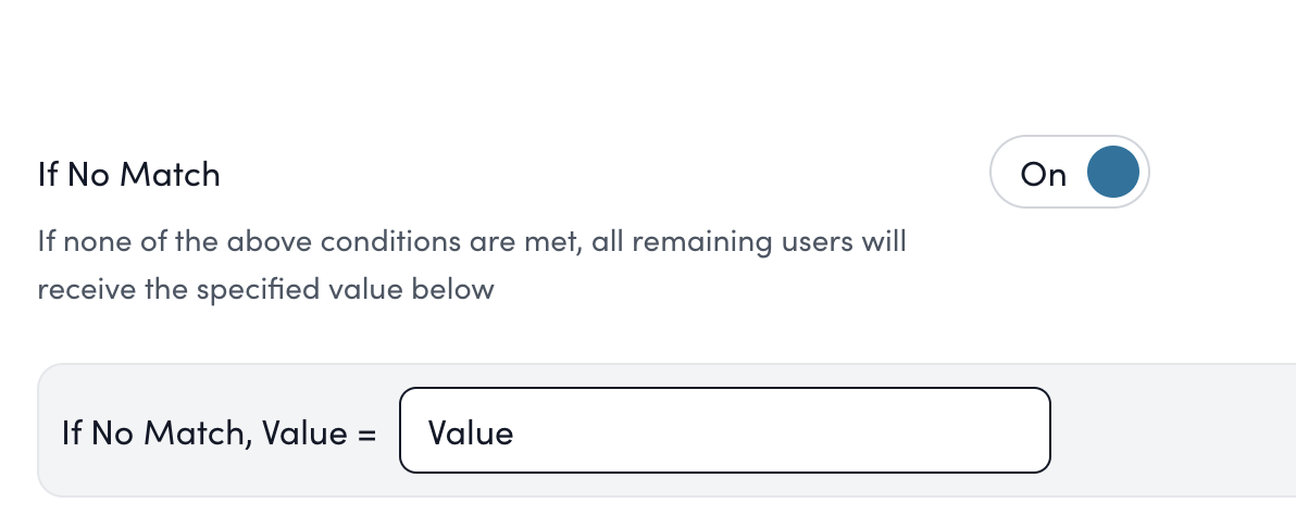 To account for all users who do not meet any of the defined rule conditions, you can utilize the “If No Match” toggle. If none of the preceding conditions are satisfied, all remaining users will be assigned the value specified below the toggle.