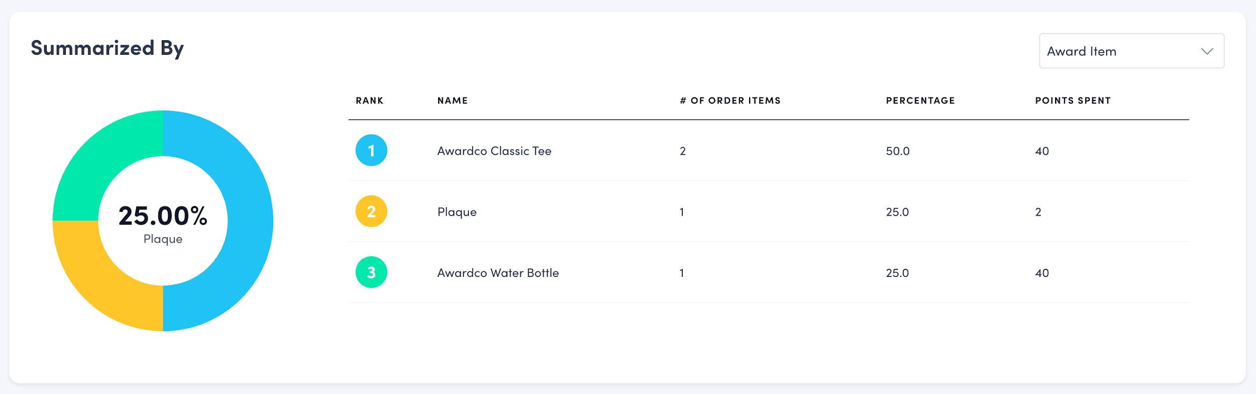 This section features a pie chart that summarizes redemption data for client-fulfilled items based on different filter categories available in the drop-down menu to the right of the graph title. The initial filter applied here is "Award Item," providing insights into the most frequently redeemed client-fulfilled items.
