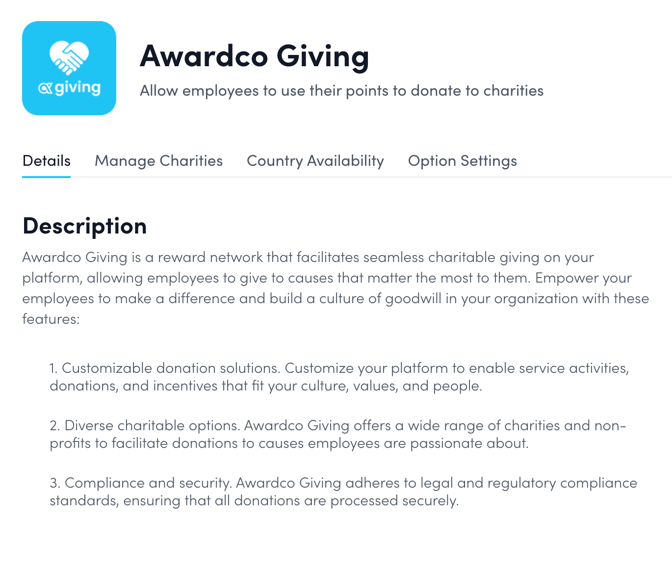 - Description: A brief message that users will see when they select the Awardco Giving option.