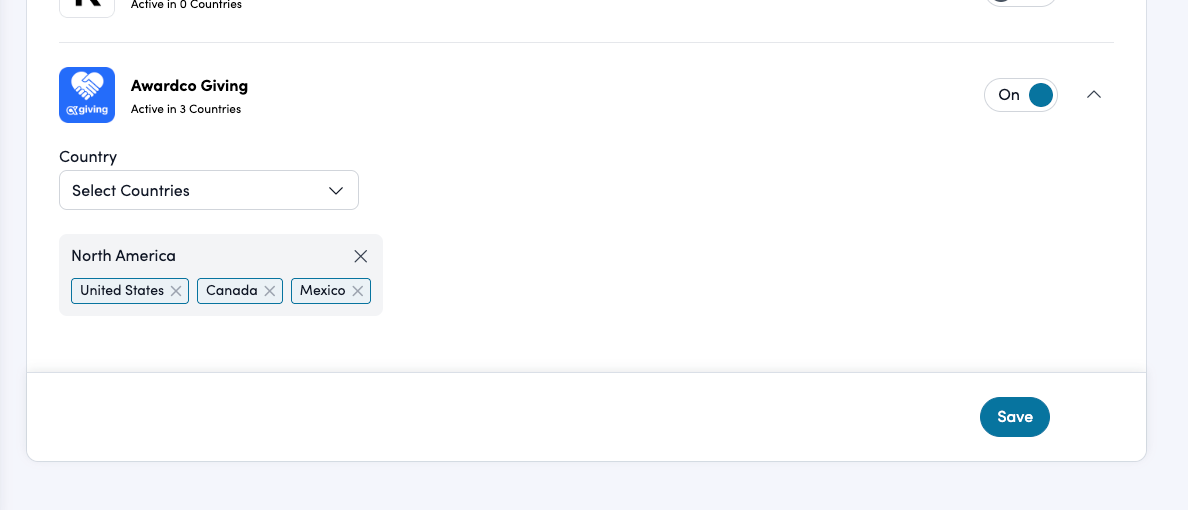- In the Award Options tab for the organization (see How to Enable Awardco Giving).