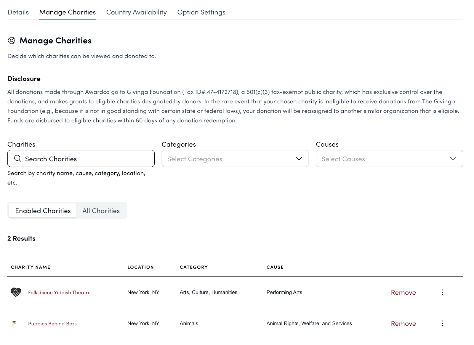 - Navigate to the Manage Charities section within the Awardco Giving settings.