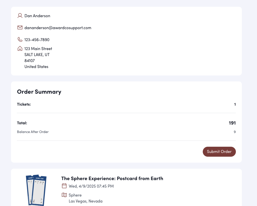 The final screen before completing your order will display a summary of all the details you have entered. Click “Submit Order” to finalize your reward redemption.