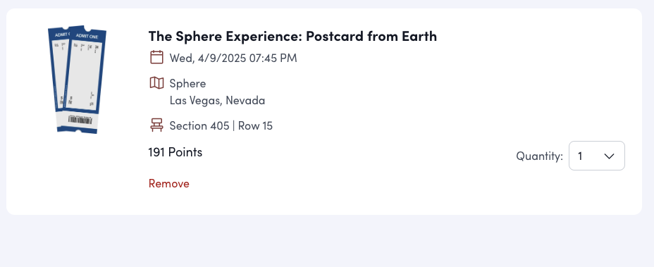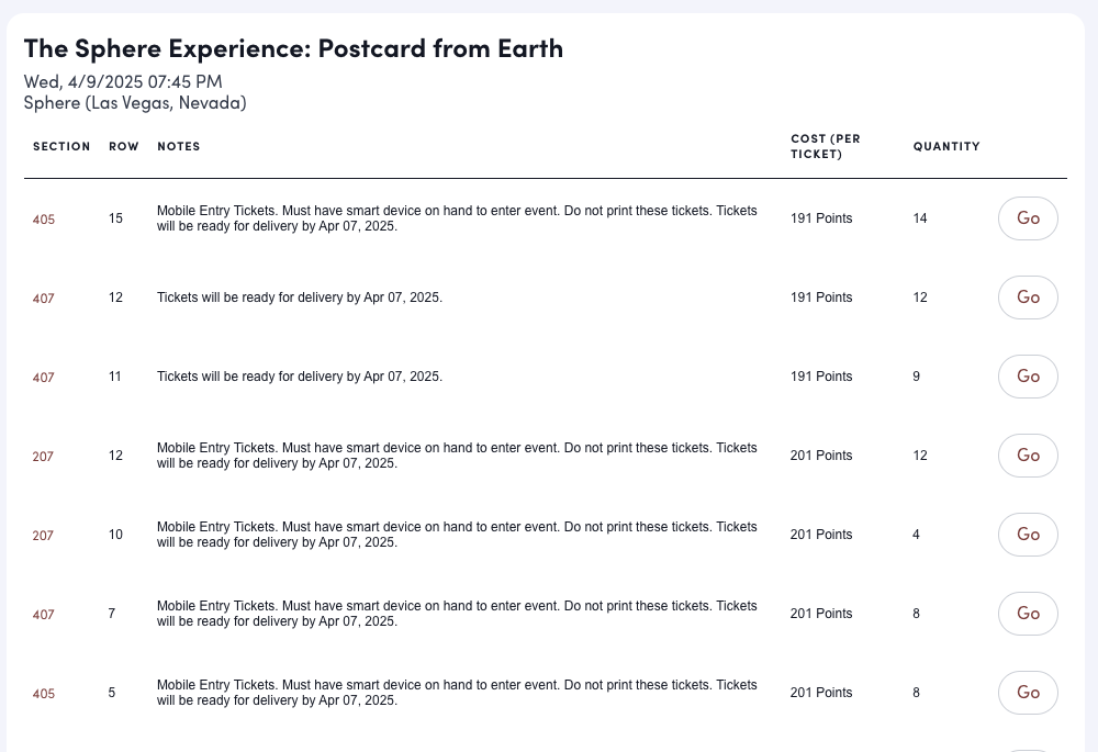 Available tickets will be listed by price in points, from lowest to highest. Click “Go” next to the tickets you wish to purchase.