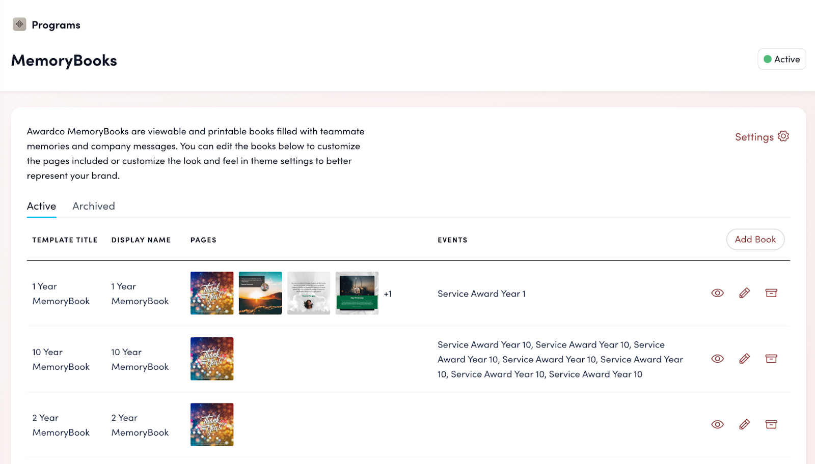 To begin using MemoryBooks, ensure that service award automation is enabled on your platform. MemoryBooks might initially appear as “disabled” in your settings, indicating that it's not yet fully activated but is still customizable.