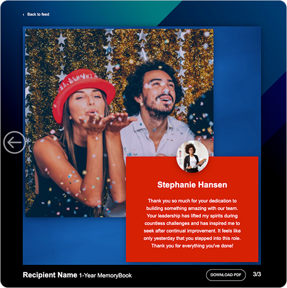 MemoryBooks compiles the teammate comments into a personalized digital experience that celebrates the award recipient's anniversary. As part of MemoryBooks, you can design standard pages to be included in each employee's individual MemoryBook. These standard pages could feature messages from organizational leadership, company values, the history of your organization, and more. The screenshots below illustrate a sample title card, a sample congratulatory message from the CEO, and a sample comment from a teammate. Each of these pages is customizable and can be tailored to match your organization's branding, emphasize company values, and highlight your program goals. Users also have the option to export their MemoryBook as a PDF.