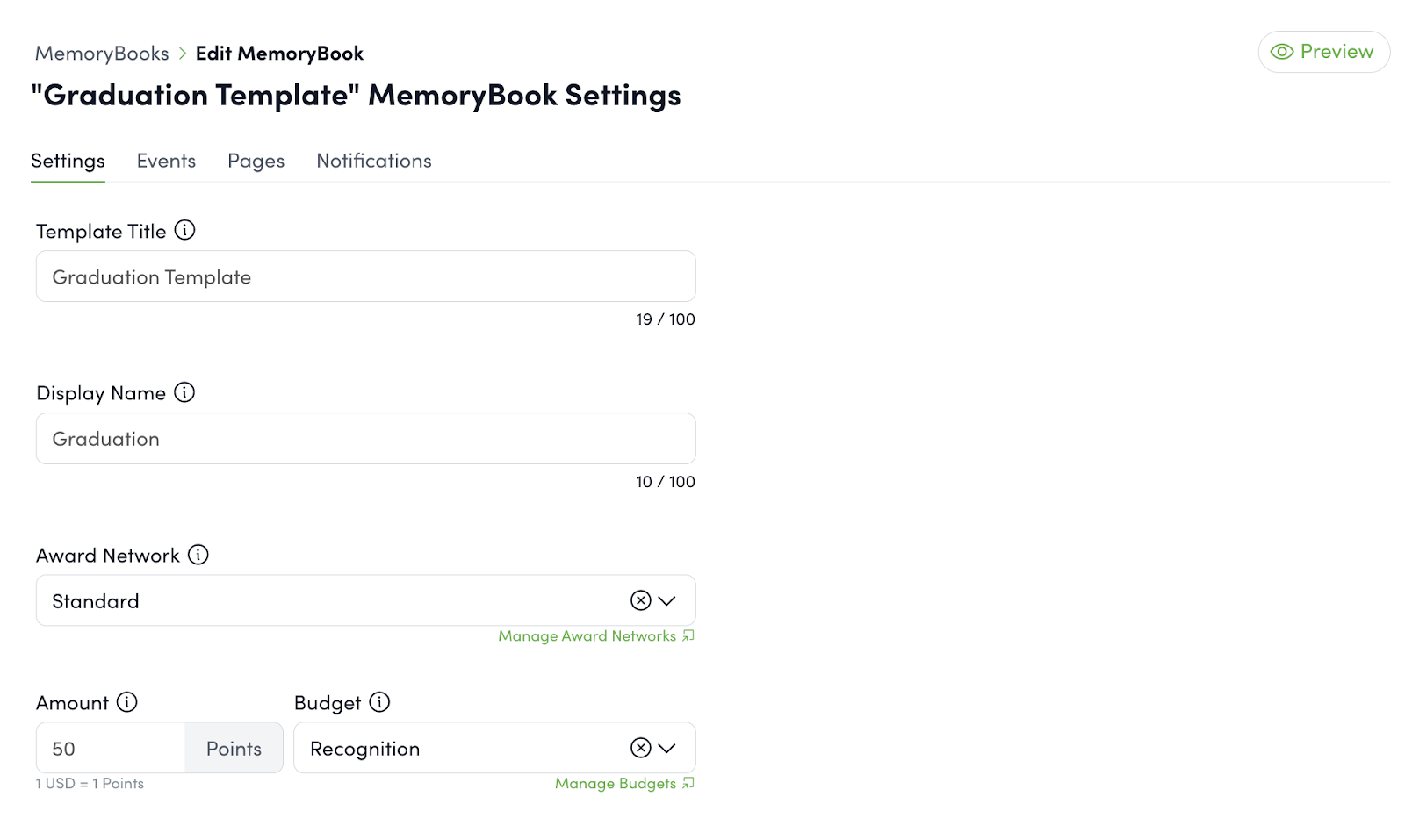 Now, you're ready to begin step two and customize the individual book experiences. Click the "Add Book" button. Enter a name for the MemoryBook Title and click "Save". Next, review the Settings Tab. The template name is what will be displayed in the settings; make it descriptive to easily differentiate between different types of MemoryBooks. The display name is what employees will see throughout the platform. This will appear in the Upcoming Milestones Widget, on the comment page, and in the feed. Determine if this MemoryBook will also include a monetary award. Select the award amount, budget, and award network. All recipients who receive a MemoryBook with this template will receive the same award amount.