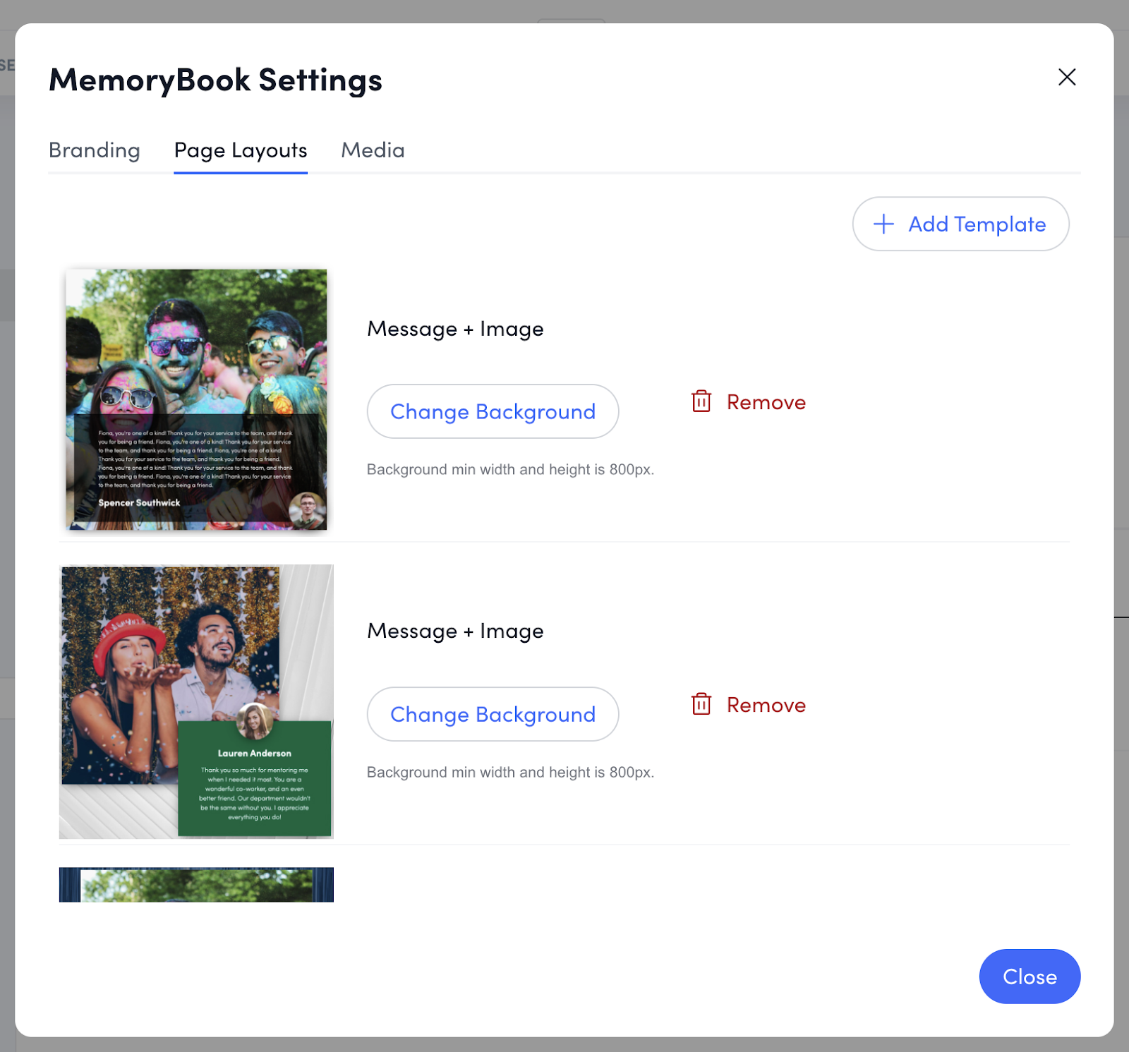 Next on this page is the Memory Templates section. Here, you can individually select the template types that will be displayed within the MemoryBook experience. These templates are used by the system to integrate the comments and images uploaded by the recipient's teammates into the digital experience. Some template types are text-only, while others support images. On this page, you can also upload custom background images for the templates. This will help you establish a consistent theme across your MemoryBooks and tailor the look and feel of the experience to your specific organization.