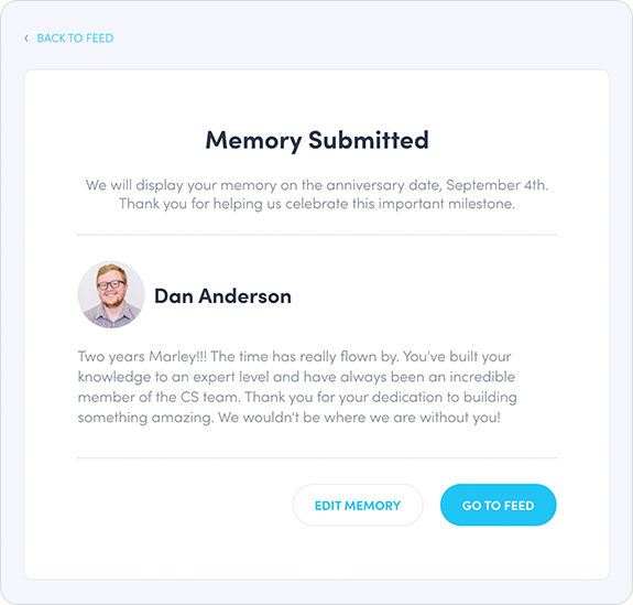 After submitting their comment, the user will be taken to a confirmation page. On this page, they can preview their comment, return to the form to make edits, and invite others to participate in the anniversary celebration. This "Invite Others" function can be disabled in the settings, but we recommend enabling it so that workplace friends who may not be on the recipient's direct team can also comment and participate in the anniversary celebration. From this page, the teammate who submitted the comment can navigate away from the submission confirmation page by clicking "Back to Feed" or by using the tabs at the top of the page.