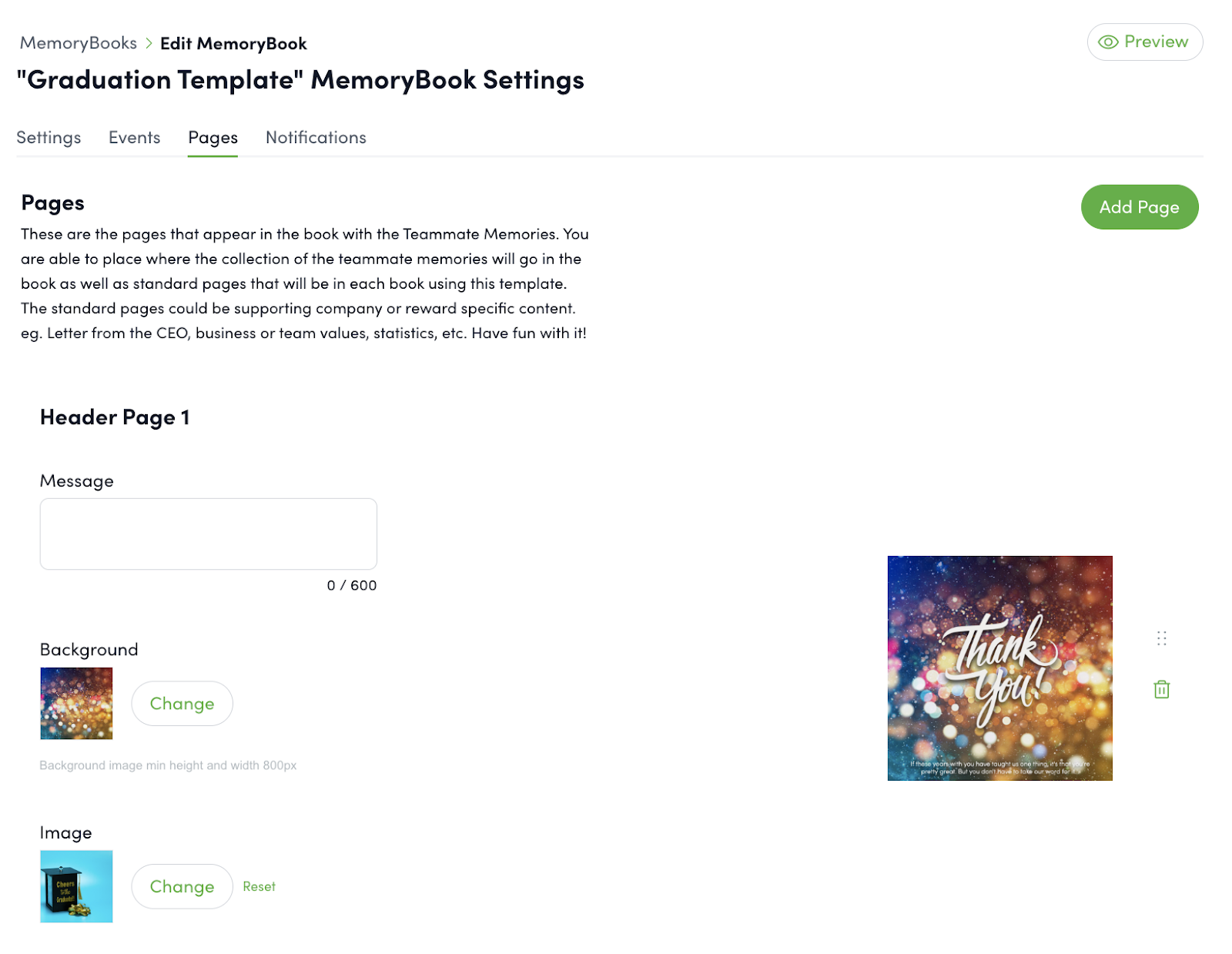 To begin with step one, click "Settings" to access the configuration page. While the system will automatically incorporate your general platform branding and create a custom background based on the colors defined in your branding tab, you have the option to choose alternative branding colors, a logo that will appear only in the MemoryBook, and upload a custom background image.
