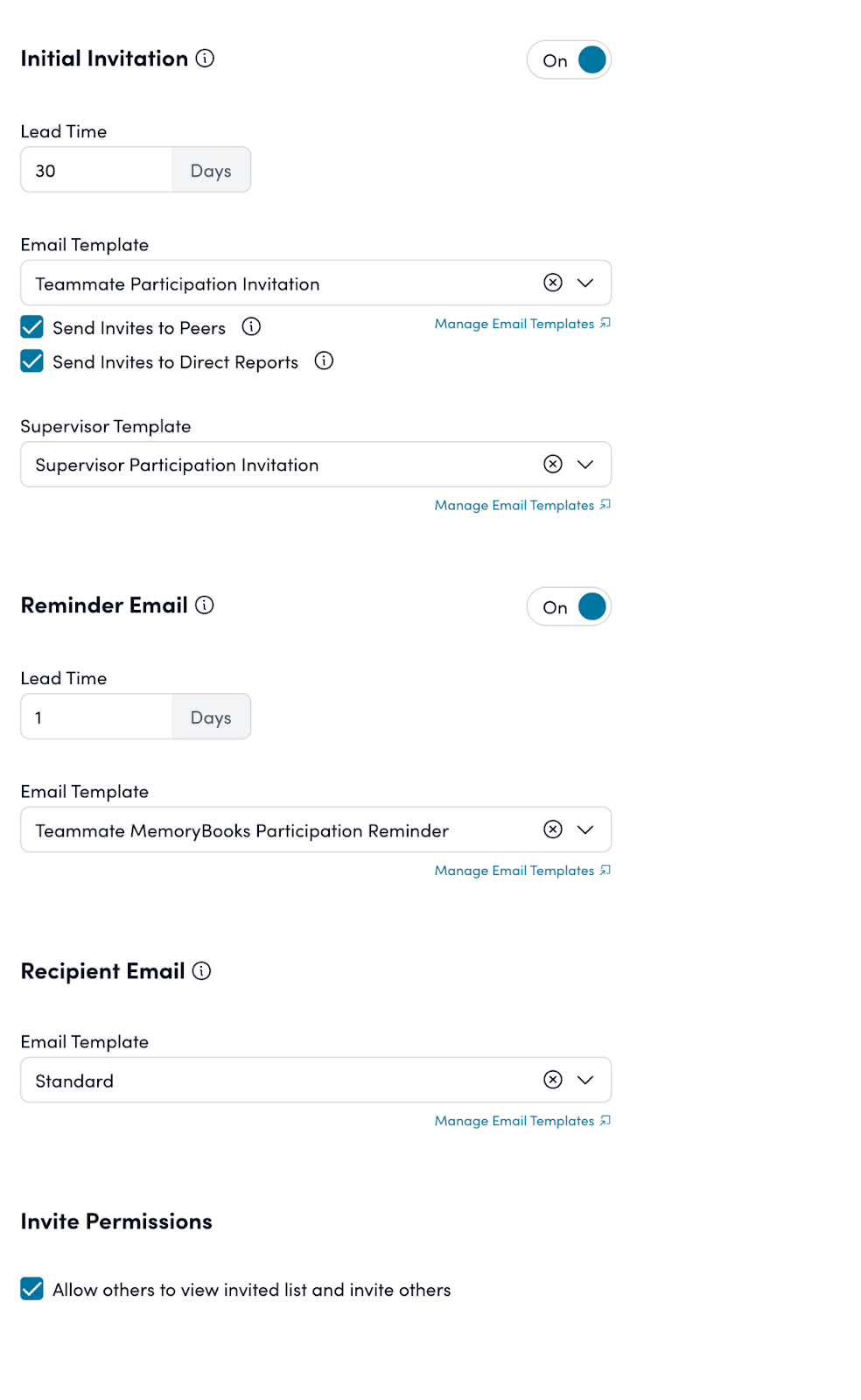 Note: If colleague notifications (both Peers and Direct Reports) are disabled, One-off MemoryBooks will not automatically send any invitation emails for colleagues to comment. At least one of these options must be enabled if you want automatic colleague invitations for One-off MemoryBooks.