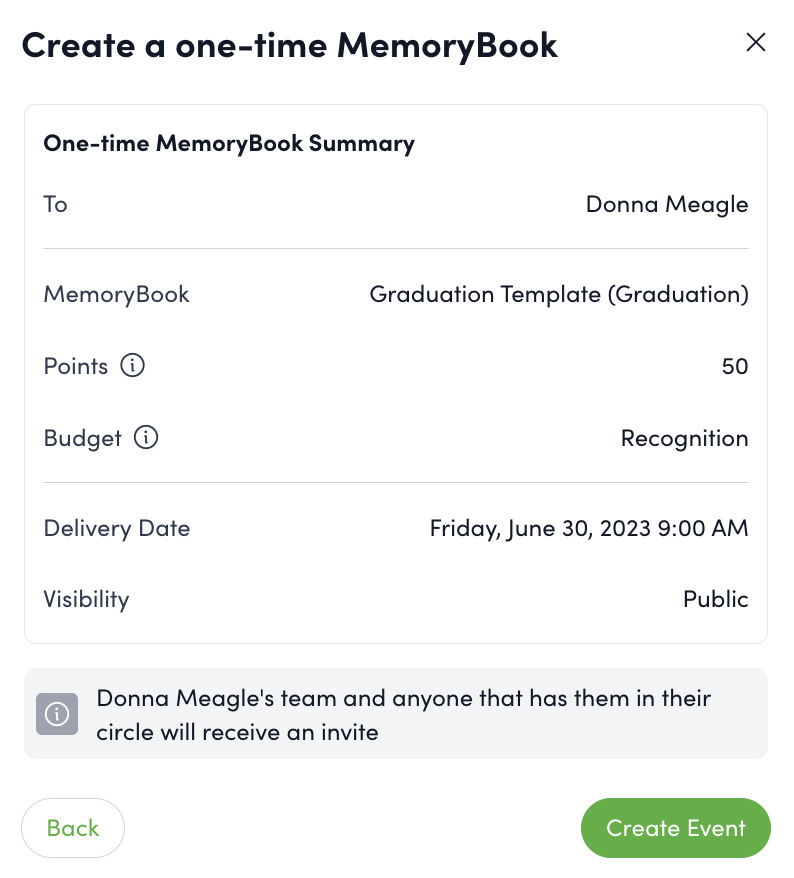 Select the recipient of the MemoryBook, the template you wish to use, the date the book should be given to the recipient, and the visibility settings. If the teammate invite lead time has already passed, the invitation emails will be sent out at the top of the next hour.