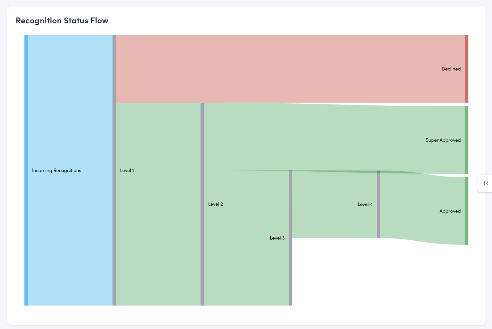 The following Approval Process chart shows at a glance where recognitions sit in the approval process. This type of graph is used to show a flow from one set of values to another, in this case, from approval submission to completion. The blue portion represents Incoming Recognitions, the green areas represent approvals moving through different levels of approval, the red field illustrates recognitions that have been declined, and the gray horizontal lines mark the different levels of approval. Hovering over the different sections of the flow chart displays the number of recognitions in each stage of the approval process.