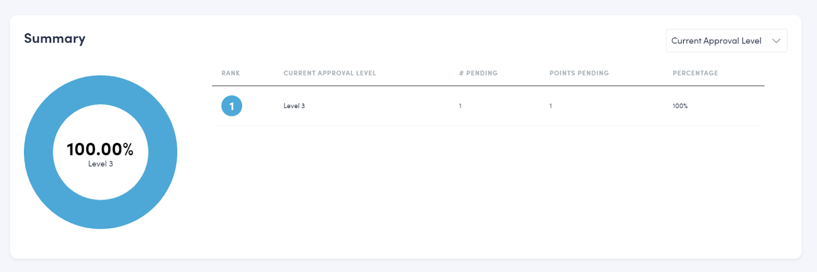 This section shows a pie chart that summarizes user data from different filter categories presented in the drop-down menu to the right of the graph title. The initial filter applied here is Current Approval Level. This view provides another insight into the number of recognitions sitting at different approval levels and the points values associated with each. Other drop down categories provide view into information such as which recognition programs the approvals come from, and which budgets the points are pending to be pulled from.